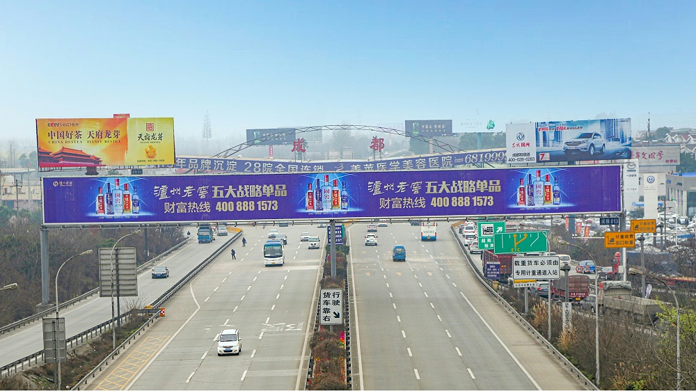 成雅龍門架廣告(收費(fèi)站旁):該戶外廣告位于成雅高速收費(fèi)站前200米,300平米的超大媒體。氣勢(shì)雄偉,關(guān)注度高。強(qiáng)制性宣傳效果好。