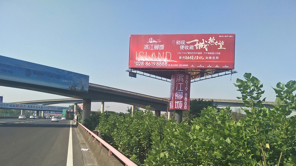 成雅高速?gòu)V告(與繞城交匯):該戶外廣告覆蓋環(huán)球中心、南延線以及劍蘭大道等路段來往車流。三面 單立柱廣告醒目,效果極佳。