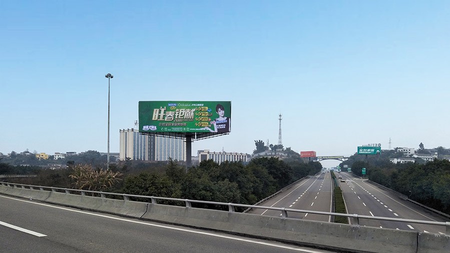 隆納高速廣告(瀘州出口右):該戶外廣告所處路段是通往隆昌、內(nèi)江、重慶、納溪的重要交通要道。媒體視野開闊,可視距離高,是廣告推廣效果好。